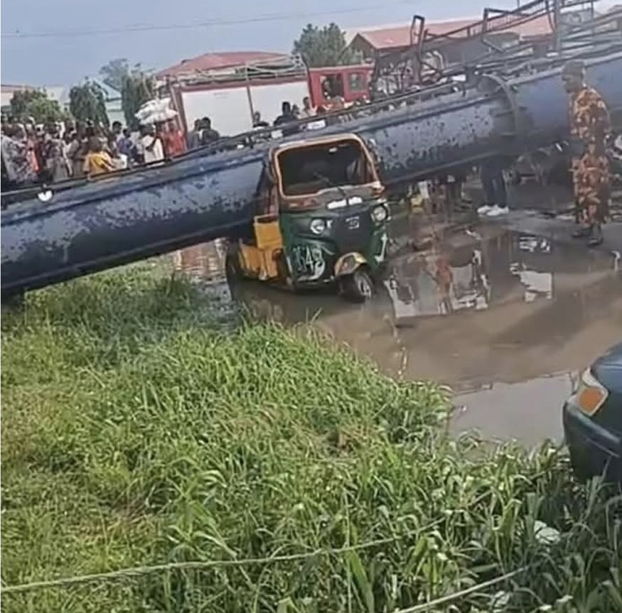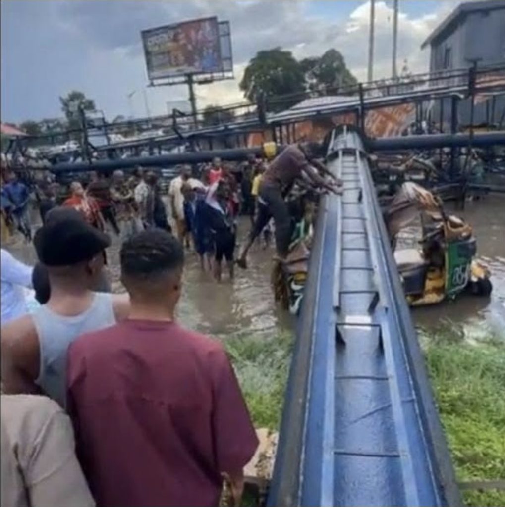 A massive iron billboard has reportedly collapsed, crashing down on multiple moving tricycles (Keke Napeps) in a horrifying scene. Eyewitnesses describe a chaotic aftermath, with screams filling the air as passersby and residents rushed to rescue those trapped beneath the wreckage.
