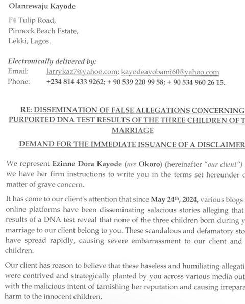 Dora has now come out to deny the allegations through her legal representatives, who sent a letter to Kayode, ordering him to stop spreading malicious lies against their client and her kids in the media. She also said a DNA test was not conducted.