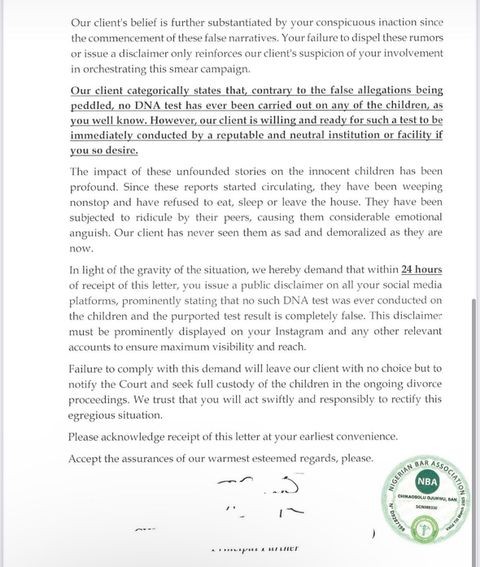 The statement also asked the Super Eagles star to issue a public disclaimer, stating no DNA test was conducted on any of three kids they both share together.