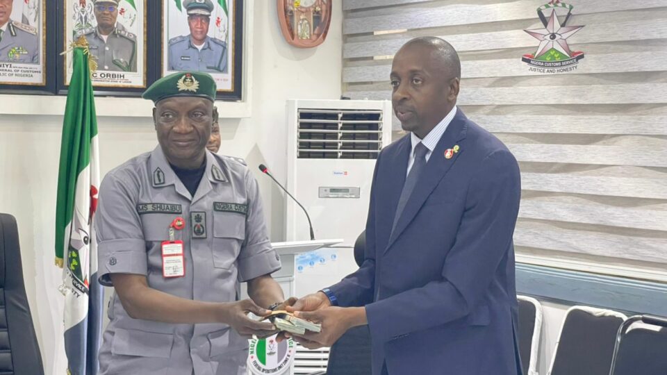 The Nigeria Customs Service, Federal Operations Unit Zone A, hands over undeclared $20,000 and 110,000 West African CFA Francs to officers of the Economic and Financial Crimes Commission. Credit: NCS
