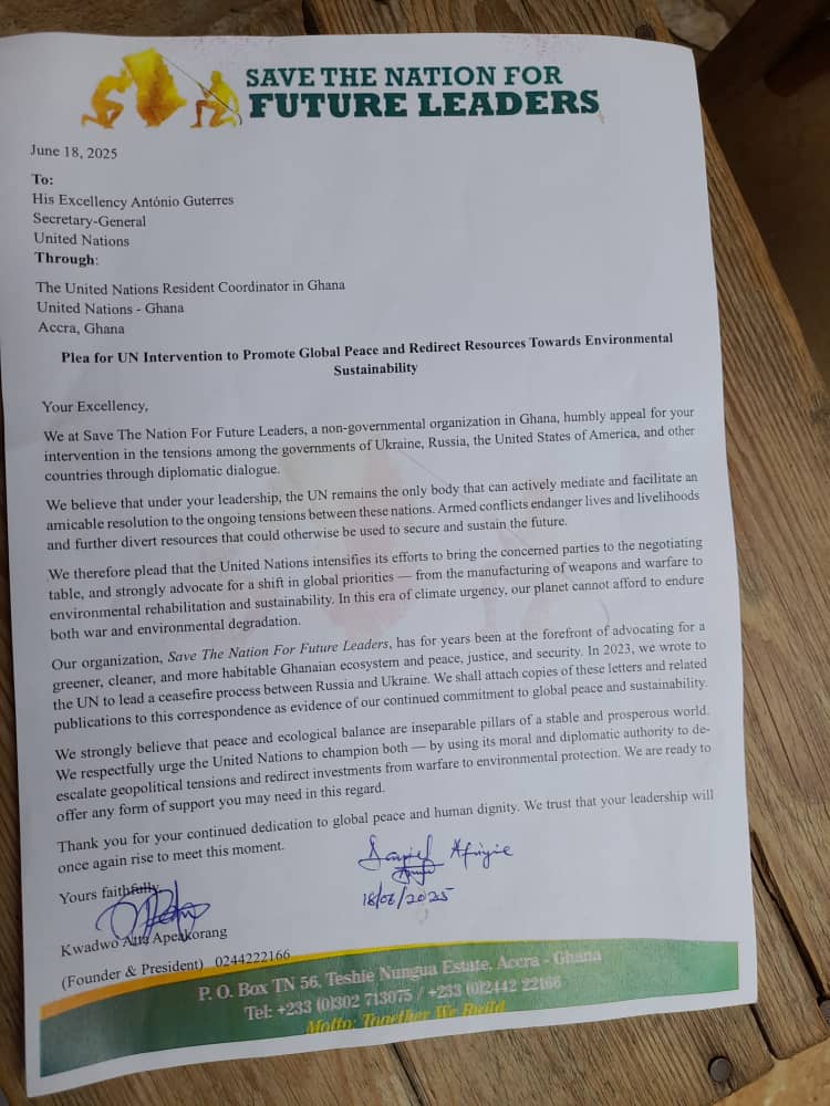 Our organization, Save The Nation For Future Leaders, has for years been at the forefront of advocating for a greener, cleaner, and more habitable Ghanaian ecosystem and peace, justice, and security. In 2023, we wrote to the UN to lead a ceasefire process between Russia and Ukraine. We shall attach copies of these letters and related publications to this correspondence as evidence of our continued commitment to global peace and sustainability.