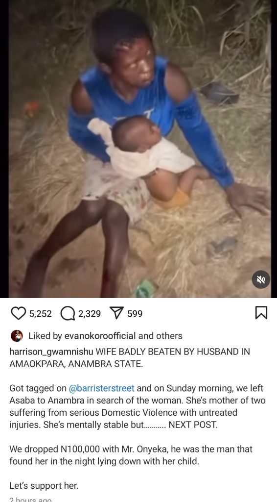 Humanrights activist, Harrison Gwamnishu, rescues woman severely beat£n up by her husband and thrown out of their home alongside their little children in Anambra.