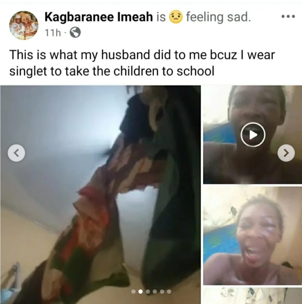 In a Facebook post on Thursday, January 23, Kagbaranee Imeah posted photos of her bl0..0.d.ied and sw0.llen face, saying that her husband ass@ulted her simply because of her choice of outfit for school runs.