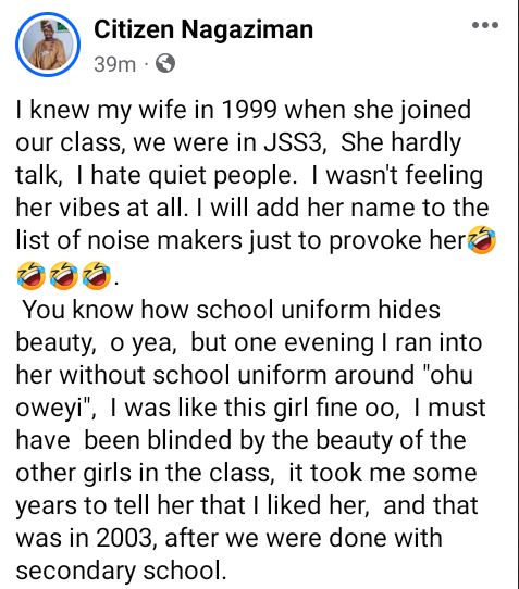 “I knew my wife in 1999 when she joined our class, we were in JSS3, She hardly talk, I hate quiet people. I wasn’t feeling her vibes at all. I will add her name to the list of noise makers just to provoke her,” he wrote in a Facebook post on Thursday, December 28, 2023.