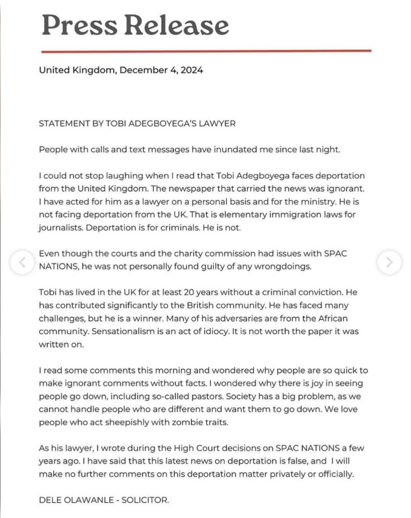 In response to recent reports suggesting that Pastor Tobi Adegboyega is facing deportation from the United Kingdom, his lawyer has issued a firm denial, calling the claims “false and sensationalized.”