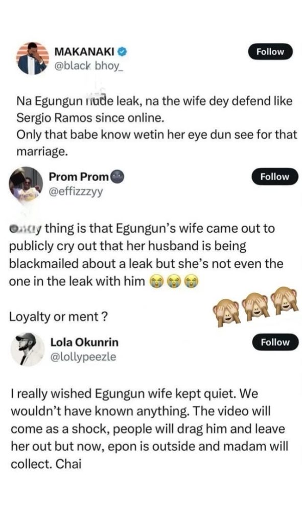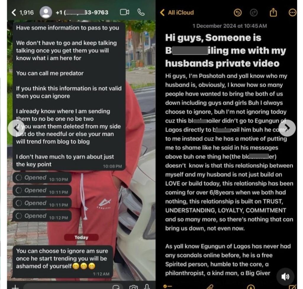 In a recent post, Egungun’s wife also shared screenshots of blackmail messages from an anonymous sender, claiming attempts to tarnish her husband’s reputation. Despite her support, the leaked video has fueled heated debates on social media.