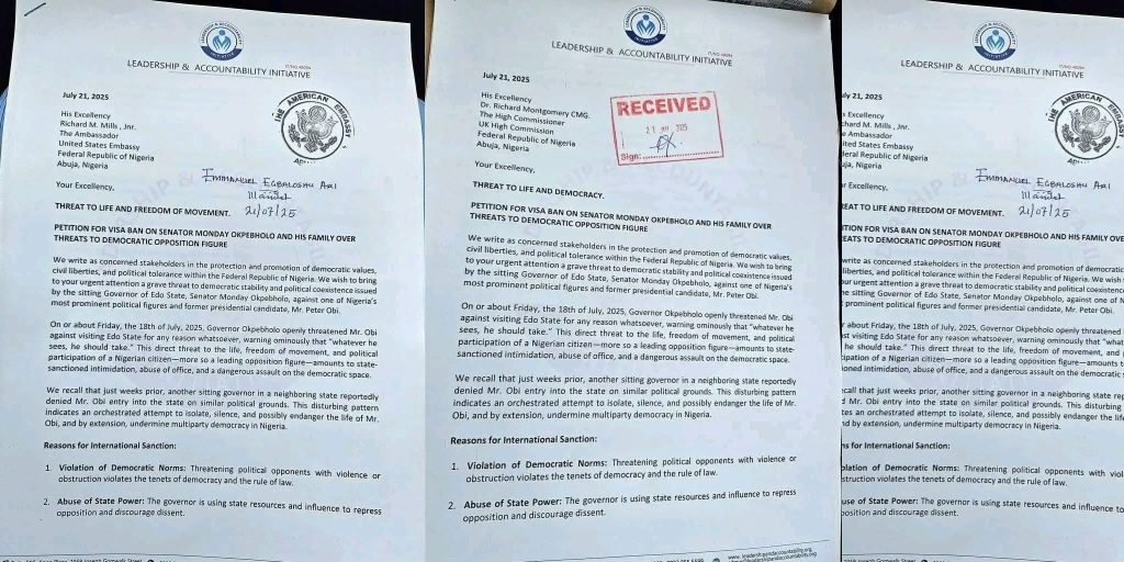 Civil society group, the Leadership & Accountability Initiative, has petitioned the United States Embassy in Abuja, calling for a visa ban on Edo State Governor, Senator Monday Okpebholo, and his family members over the “state-sanctioned threats” to former presidential candidate and Labour Party leader, Peter Obi.